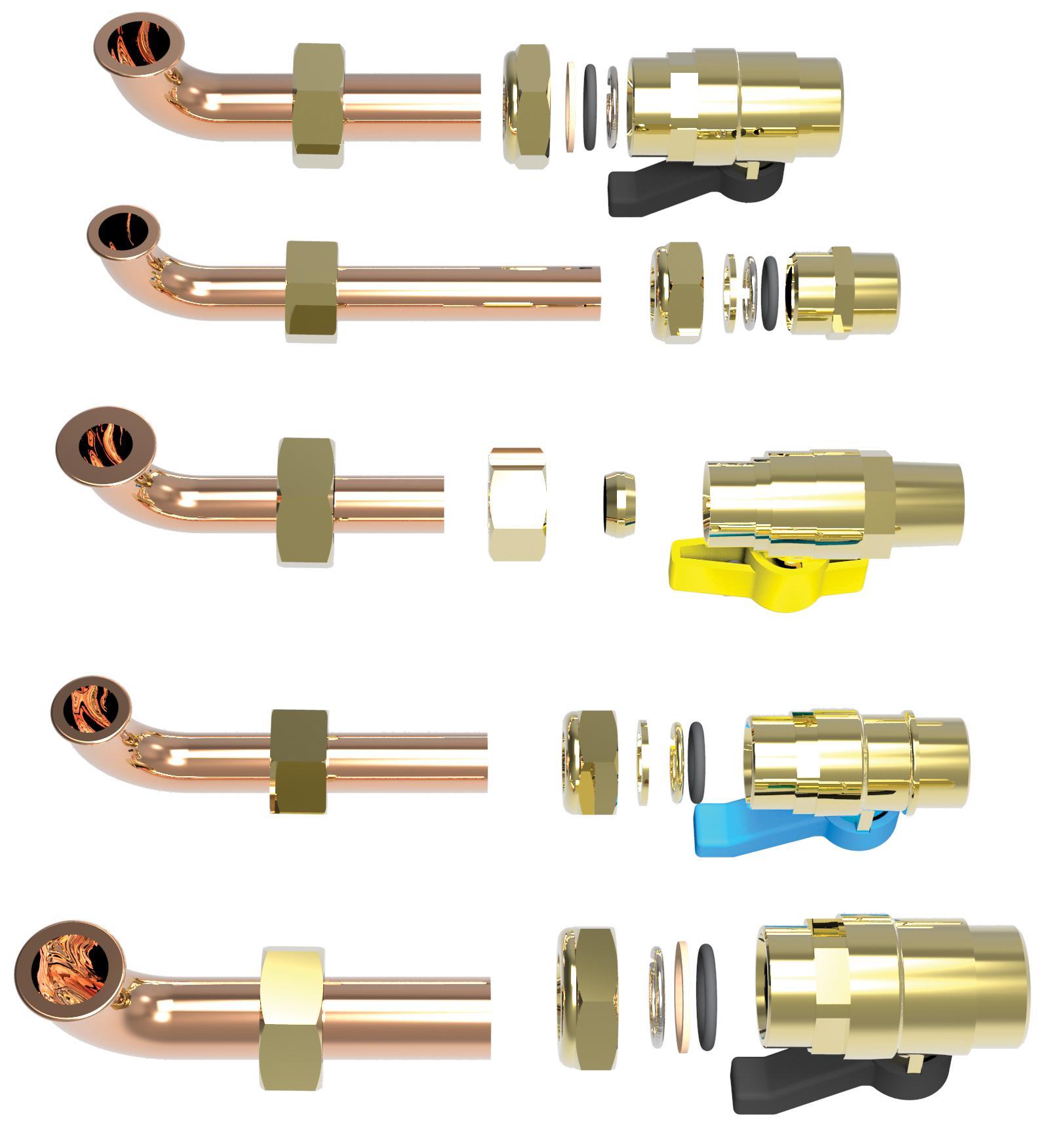 Kit collegamento attacchi completo di rubinetto gas con ogiva, rubinetto acqua sanitaria, n° 2 rubinetti impianto, tubazioni, nipplo, guarnizioni.
